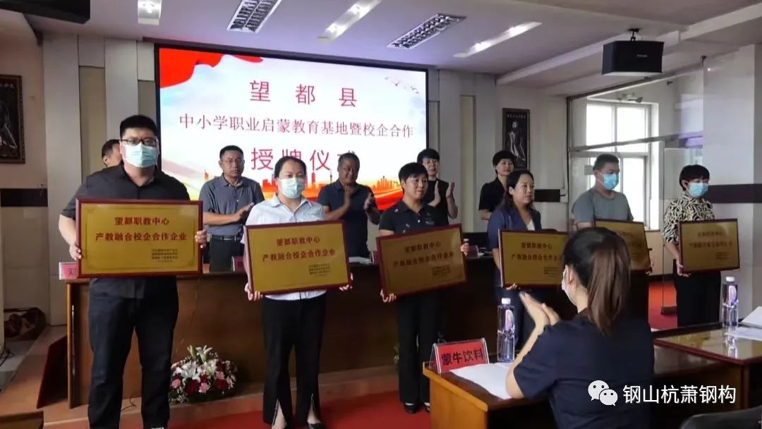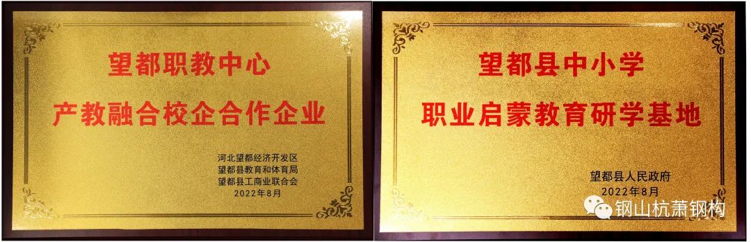8月23日,河北钢山杭萧钢结构工程股份有限公司参加“望都县中小学职业启蒙教育研学基地”和“望都县职教中心产教融合校企合作”名牌授牌仪式,正式成为我县校企合作企业。