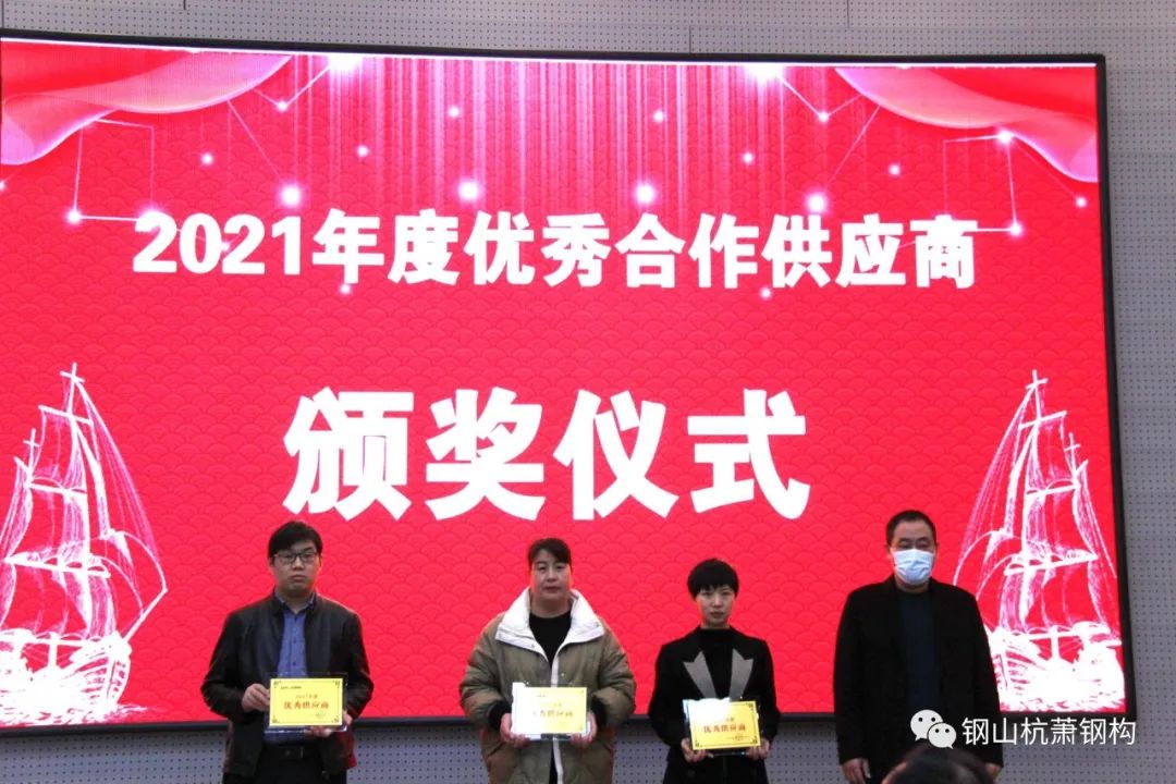 会上,钢山杭萧对2021年合作优异的3家供应商授予优秀供应商称号,分别是:保定市中旻(民)焊接器材有限公司、河北普力特紧固件制造有限公司、天津山钢金属科技有限公司。