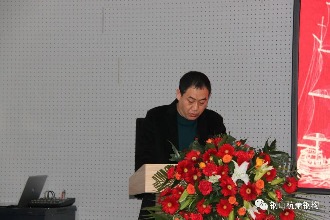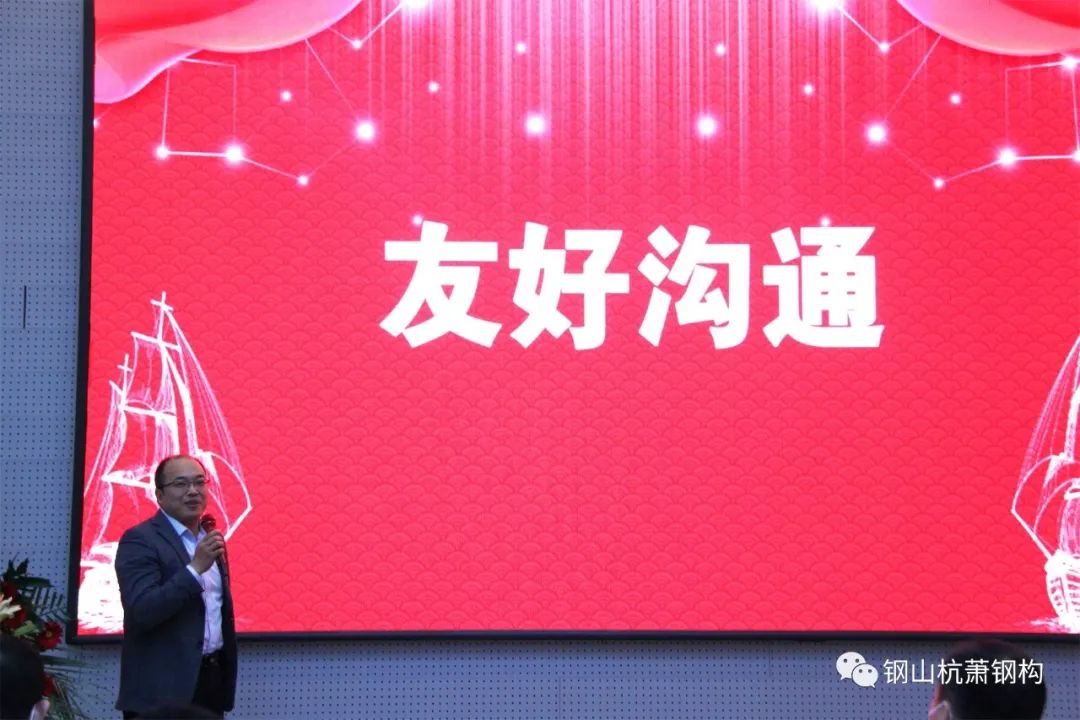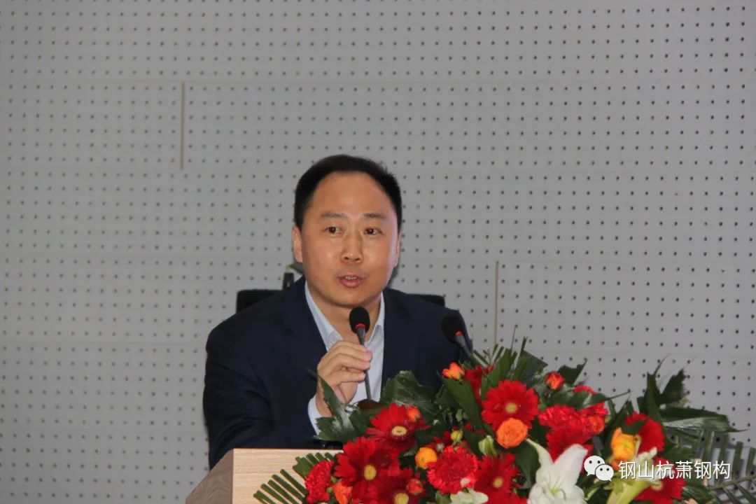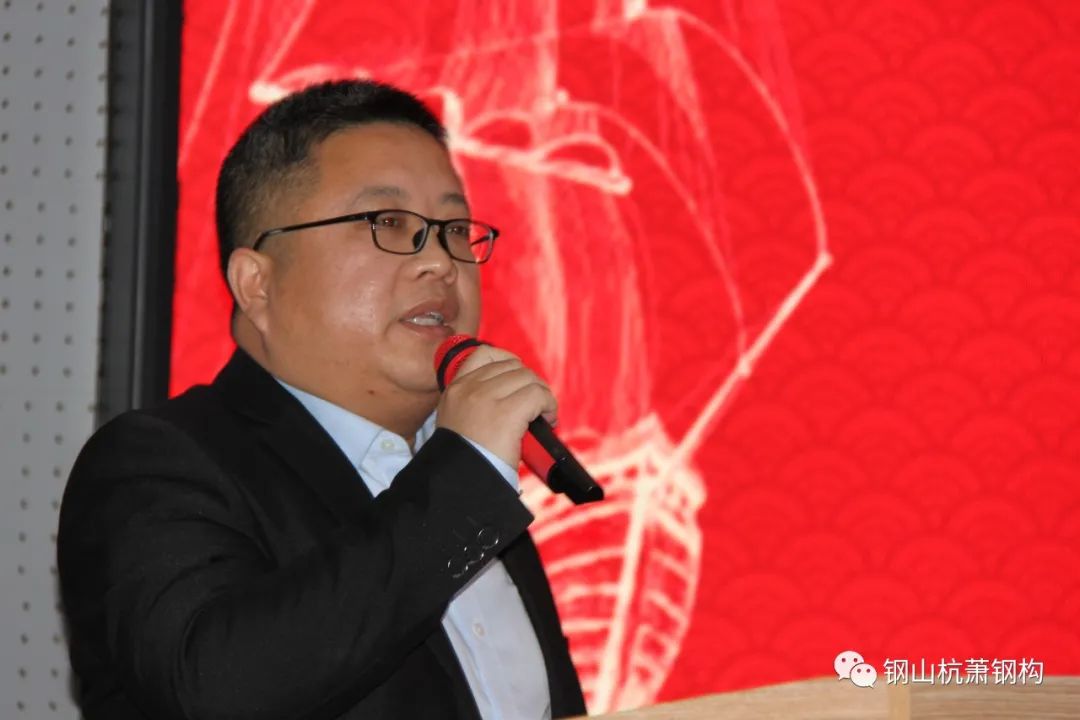 随后,钢山杭萧总经理——武强发表致辞,他表示,钢山杭萧在建厂初期钢山杭萧业绩平平,项目屈指可数,员工也只有几十名,给各位合作伙伴带来不便。2021年钢山杭萧开始转型以“打造绿色钢结构装配式建筑,助推建筑产业化”发展定位和战略目标,在受国际市场的影响,国内各种材料持续上涨的压力下,钢山杭萧全员齐心协力硬是突破了5亿的销售额,签订19个项目,完工项目10个,产量由几千吨上升为4万吨。钢山杭萧取得优异成绩是与各位合作伙伴的紧密配合,相互支持,共同成长是分不开的。钢山杭萧与供应商将在坦诚公开的关系中营造共荣共生、共同发展的互惠双赢局面!
