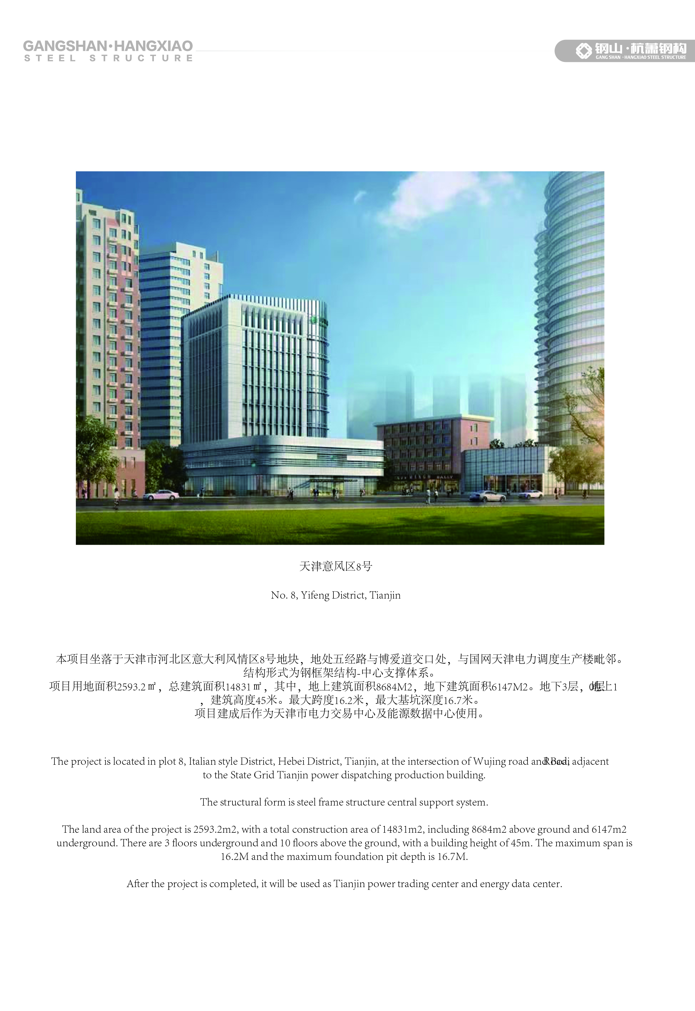 天津意风区8号 本项目坐落于天津市河北区意大利风情区8号地块,地处五经路与博爱道交口处,与国网天津电力调度生产楼毗邻。 结构形式为钢框架结构中心支撑体系。