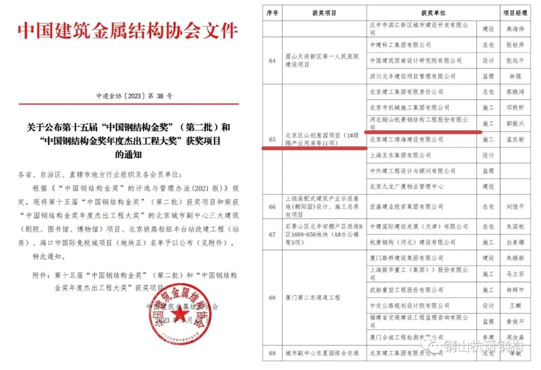近日,中国建筑金属结构协会公布了第十五届 “中国钢结构金奖”(第二批)获奖项目名单,河北钢山杭萧钢结构工程股份有限公司(以下简称钢山杭萧)参建的北京巨山创意园项目荣获第十五届“中国结构金奖”!
