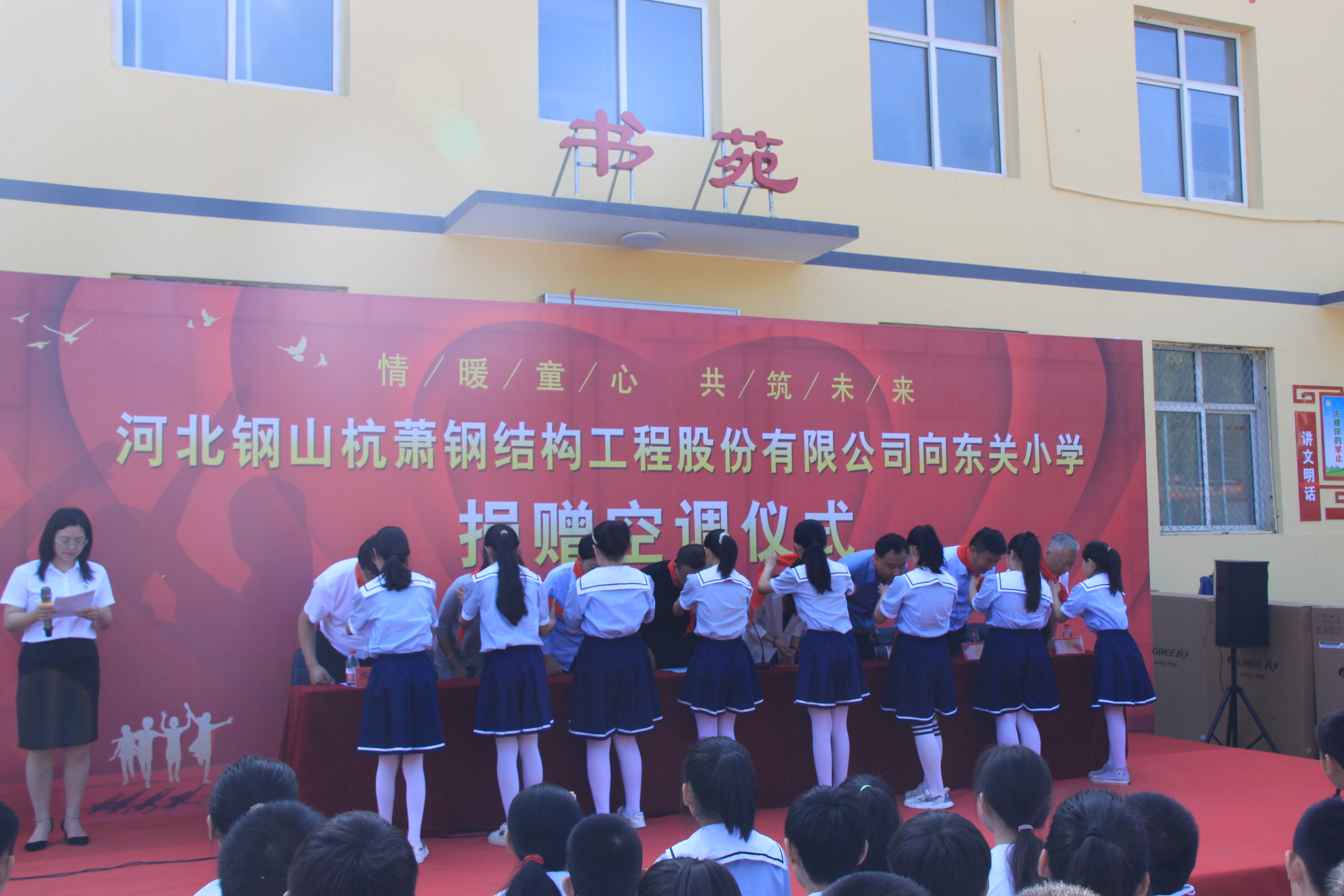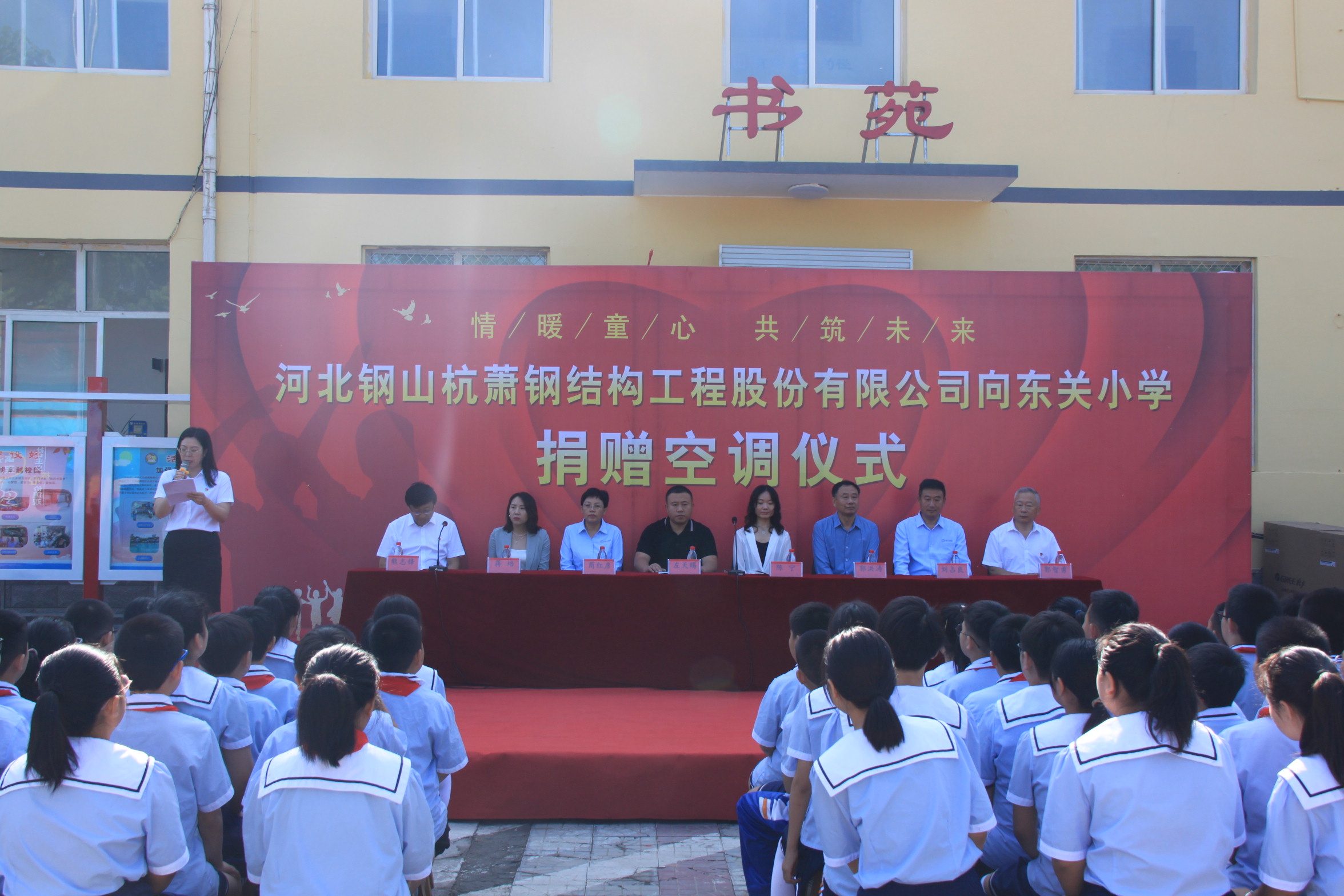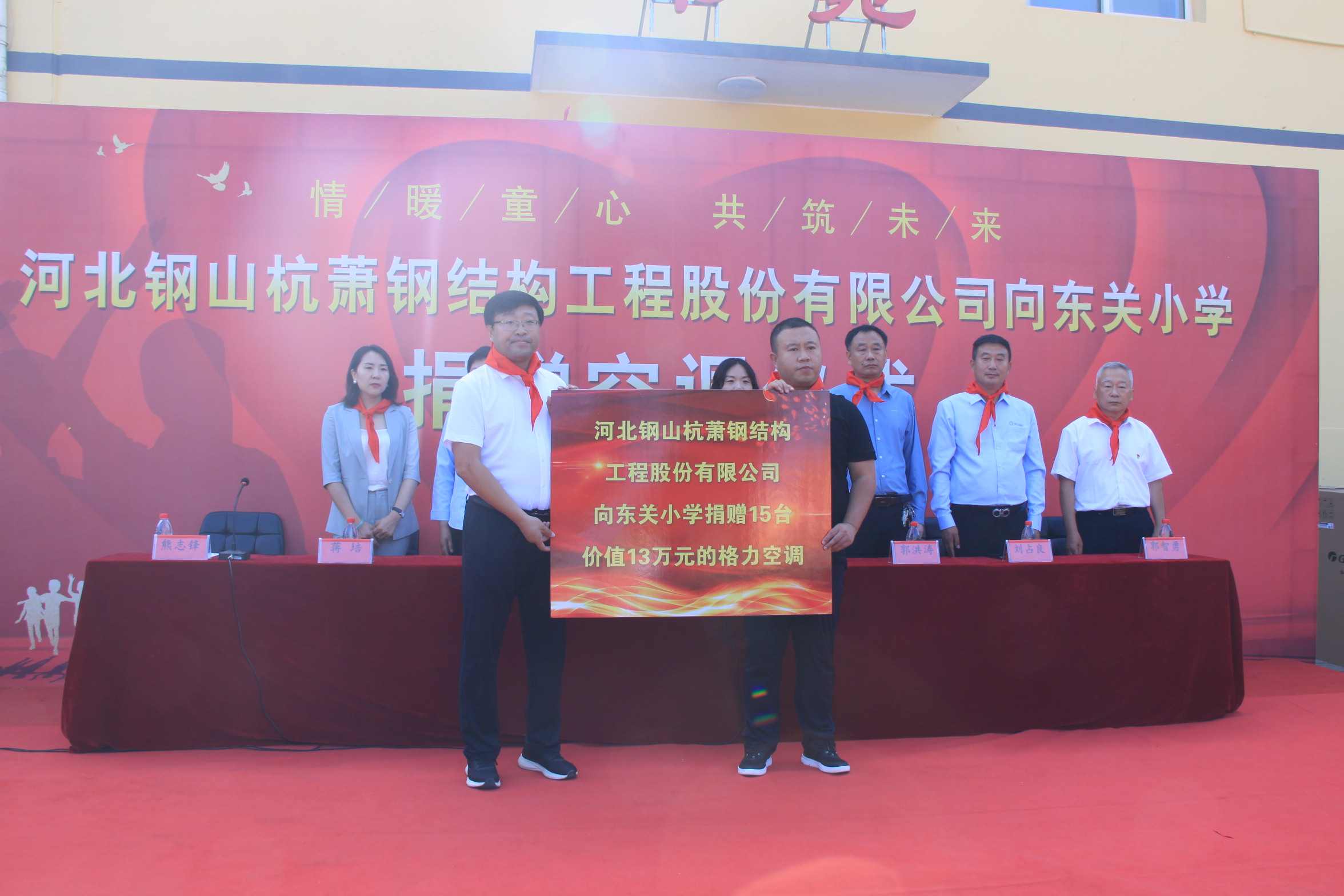 夏日送清凉,关爱沁人心。为进一步改善和优化学生的学习环境,积极履行社会责任,弘扬良好道德风尚,河北钢山杭萧钢结构工程股份有限公司(以下简称钢山杭萧)向望都县东关小学捐赠价值13万元的空调以解决学校剩余教室无空调问题,并于6月20日在东关小学举行了“情暖童心 共筑未来”捐赠仪式。