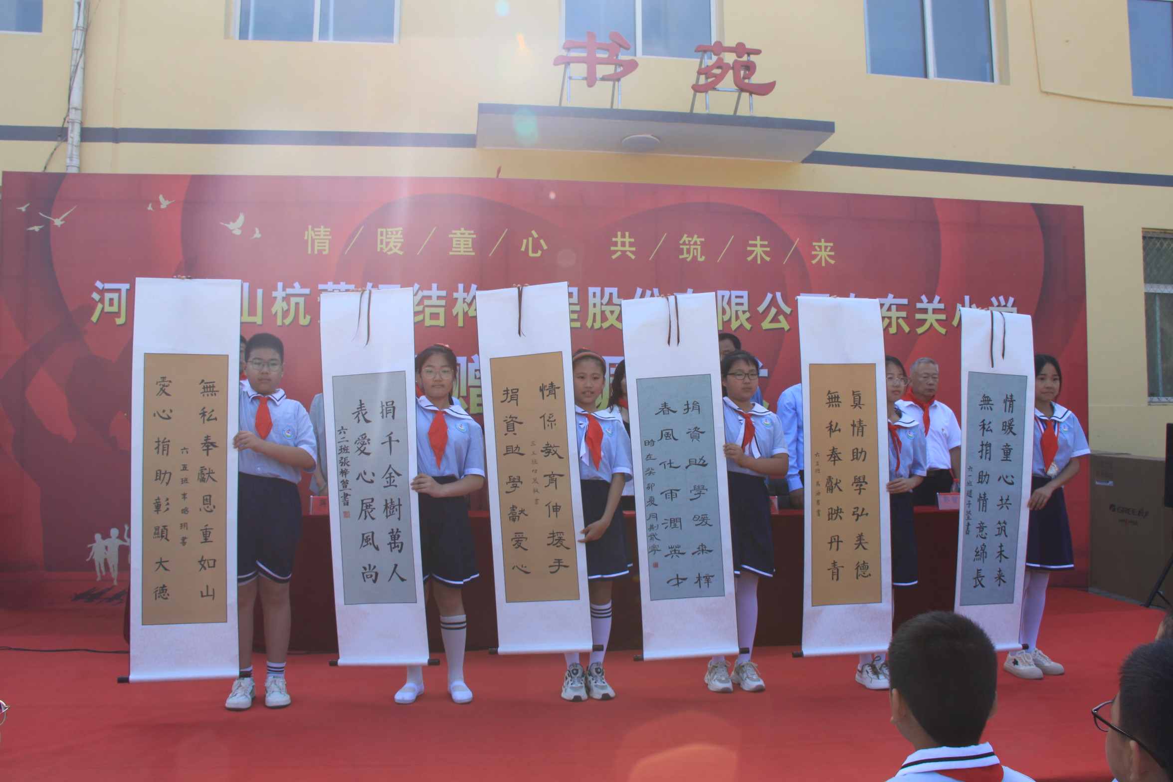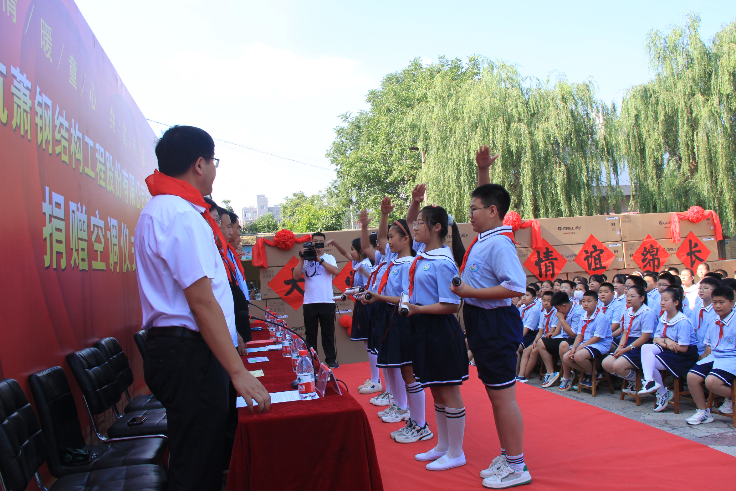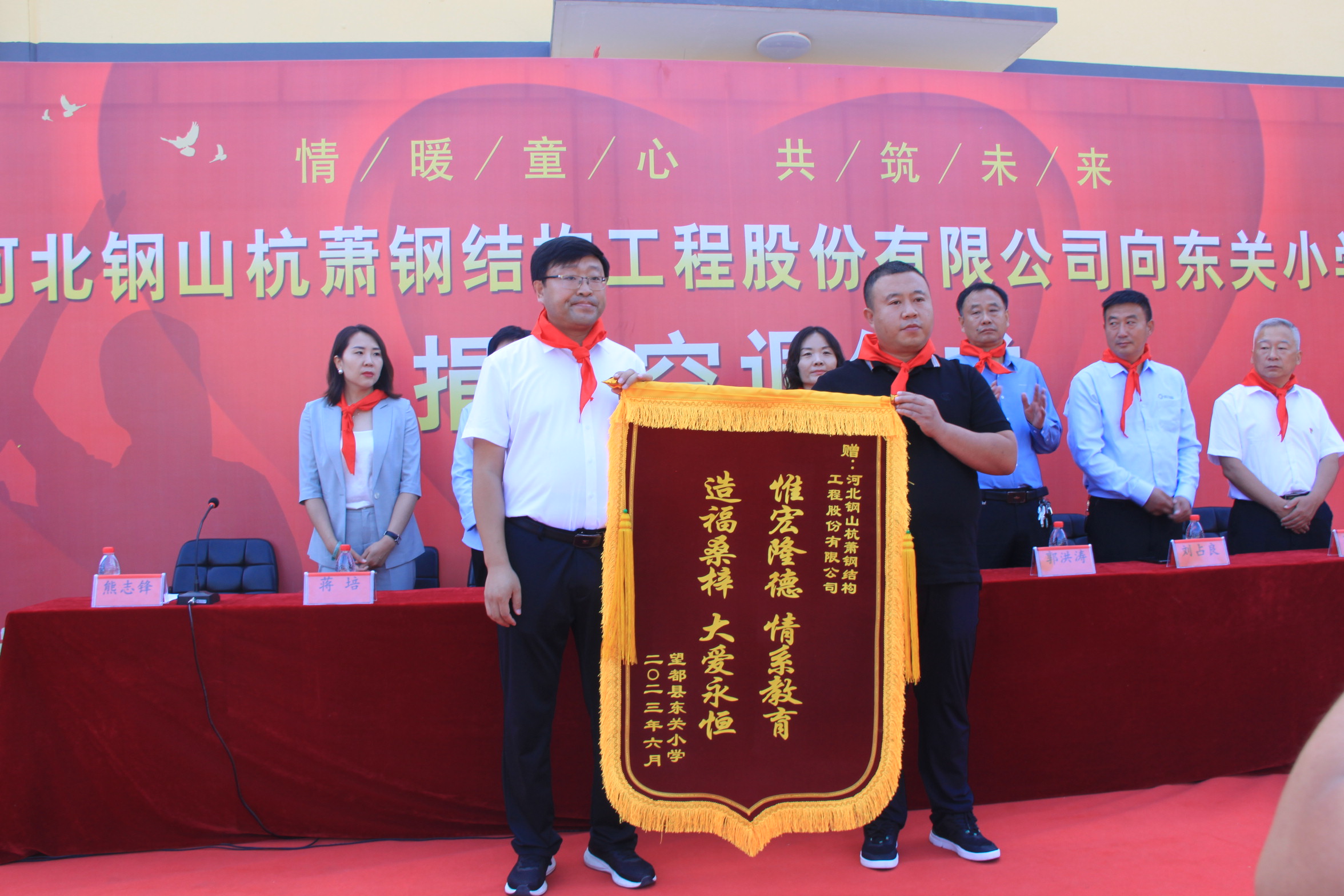 夏日送清凉,关爱沁人心。为进一步改善和优化学生的学习环境,积极履行社会责任,弘扬良好道德风尚,河北钢山杭萧钢结构工程股份有限公司(以下简称钢山杭萧)向望都县东关小学捐赠价值13万元的空调以解决学校剩余教室无空调问题,并于6月20日在东关小学举行了“情暖童心 共筑未来”捐赠仪式。